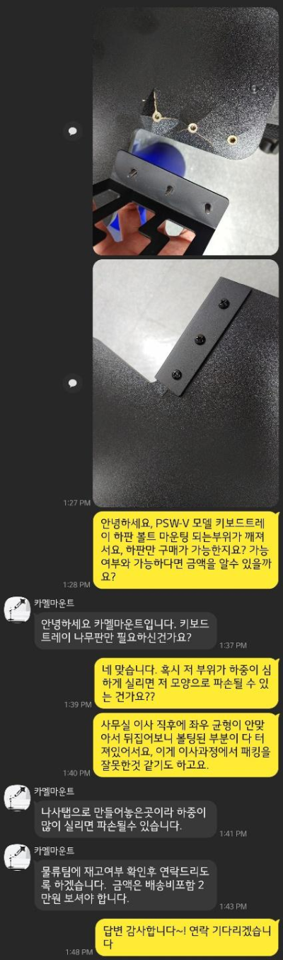 네이버에서 구매했던게 기억나서 네이버 카멜마운트 판매 페이지 (네이버 톡?) 뭐 이런 곳에 문의 를 남겼고,